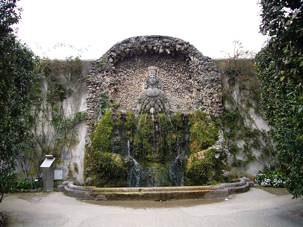 Op deze manier waren hiervoor geen omvangrijke graafwerken nodig. Het water leidde hij met gebruikmaking van het natuurlijk verloop van het hoogste punt op de zuidoostelijke hoek via zich vertakkende hoofdleidingen over het hele terrein. De oude toegang tot tuin en villa bevond zich in het dal. Men had bij het betreden dus de hele zich naar boven uitstrekkende tuin voor zich met de facade van het slot als afsluiting. De huidige toegang vanuit het slot geeft de bezoeker een foute indruk. Hoe een 16de-eeuwse bezoeker het geheel beleefde maakt een beschrijving in een brief uit 1569 van Foglieta duidelijk. De fontein die na de verwijdering van alle antieke beelden nog het best de humanistische ideeën van bouwheer en architekt laat zien, is de Romefontein hoewel nu nog maar weinige van de oorspronkelijke onderdelen behouden zijn. Rondom het standbeeld van Roma plaatste Ligorio verkleinde bouwwerken en beelden van het oude Rome: Pantheon en tempel, stadspoort en het eiland in de Tiber, triomfzuilen en het merkteken van de stichters, de wolvin met de tweeling Romulus en Remus.
