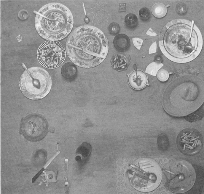 Nederigheid. Daniël Spoerri, december 1960 Hahn's diner 8 juli 1964 Gedurende het hele plakwerk van het diner, waarbij Wolfgang Hahn me hielp, weigerde hij standvastig ook maar één enkel voorwerp zelf op te plakken. 'Ik zou', zei hij, 'de objecten niet precies zo opplakken als ze er lagen en deze kleine vervreemding zou alles teniet doen.' |