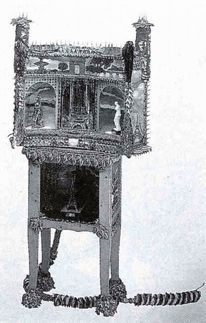 De 'poor man's materials' waarmee Zwillinger werkt, wekken gedachten op aan primitieve culturen die hun produkten met glimmende en glanzende bric à brac versieren, niet eens zozeer om de economische waarde van die produkten te vergroten, maar veel eerder om ze een spirituele meerwaarde te geven. (...) Zwillinger kreeg haar opleiding in de jaren zeventig en haar werk is altijd gebaseerd geweest op feministische uitgangspunten, op rolpatronen, op de mythes rond de vrouw in de samenleving: het opsieren van haar objecten, de exuberante aankleding van bijvoorbeeld haar high heeled shoes (bij uitstek erotische symbolen en door Zwillinger niet voor niets Foot Fetishes' genoemd) kunnen tot op zekere hoogte als een commentaar op het kop-houden-en-mooi-wezen-gedrag worden beschouwd. (...) |