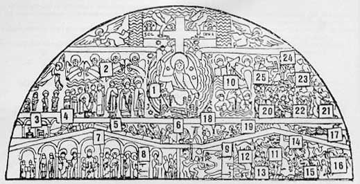 aan de kerk werden pas in deze eeuw voltooid. 1. In een mandorla (1) gekleed in een pallium (2), zit Christus als een opperrechter; op de kruisnimbus (3) is de inscriptie 'judex', rechter, aangebracht. Met zijn rechterhand wijst hij aan de uitverkorenen de hemel: 'komt gezegenden van mijn vader'; met de linkerhand wijst hij naar de hel voor de verdoemden; 'gaat heen van mij, vervloekten'. Daarboven is het kruis van Christus geplaatst tussen zon en maan; het kruis als centrum van de schepping, de wereld en de geschiedenis: 'dit teken van het kruis zal aan de hemel staan als de Heer komt oordelen'. (Matth. 24:30). (1) amandelvormige nimbus die de gehele gestalte omgeeft |