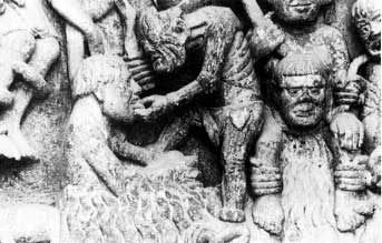 9. De hellemond. Het bijbelse monster, de leviathan (4) slokt de veroordeelden op met zijn wijdopen bek. Een duivel met een zware knots duwt ze naar binnen, terwijl hij omkijkt naar-de uitverkorenen die hem ontsnappen. 12. De trots wordt uitgebeeld door een gevallen ruiter die tijdens zijn leven begerig was naar de bezittingen van de abdij, en door de priesters van het klooster is geëxcommuniceerd. Terwijl hij door een demon wordt weggetrokken spiest een ander hem. (4) naam van een (krokodil?) uit het bijbelboek Job. |