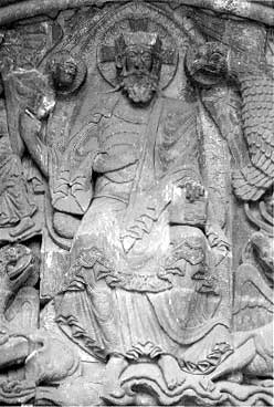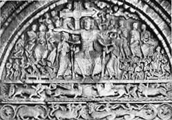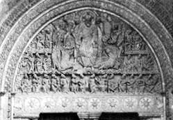 De kathedraal van Autun De kathedraal van Autun was een belangrijke pelgrimskerk, omdat zij in het bezit zou zijn van de relieken van Lazarus, de man die door Christus uit de dood was opgewekt Het timpaan van het Westportaal werd in de 18de eeuw veracht als een werk uit bijgelovige tijden; het werd overdekt met pleisterwerk (in 1837 weer verwijderd) en tegelijkertijd werd het beeldhouwwerk aan één van de archivolten vernietigd. Het onderwerp van het timpaan is het Laatste Oordeel met de opstanding van de doden op de latei (bovendorpel). (...) De compositie wordt beheerst door de centrale Christusfiguur met uitgestrekte handen, gezeten op een troon binnen een mandorla die door vier engelen wordt gedragen. |
