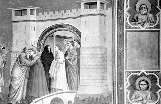 Giotto, De ontmoeting van Joachim en Anna bij de gouden poort, Scrovegnikapel, Padua | |