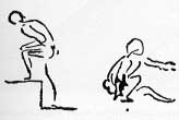 Over de beweging van de mens Als u een man wilt weergeven die bezig is een bepaald gewicht te verplaatsen, bedenk dan dat deze beweging in verschillende richtingen weer te geven is. Een man kan voorover bukken om een gewicht op te tillen met de bedoeling het op te tillen als hij overeind komt; dat is een enkelvoudige beweging van beneden naar boven; of hij kan iets naar achteren willen trekken of naar voren duwen of het gewicht met een touw, dat over een katrol loopt, naar beneden halen. Hierbij moet u erom denken dat het gewicht van een mens zich naar achter verplaatst naar mate zijn zwaartepunt verder af is van zijn steunpunt en u moet hieraan toevoegen de kracht, die door zijn benen en gebogen ruggegraat wordt uitgeoefend als hij overeind komt. Hoe een man te werk gaat die zich op zijn voeten verheft als hij op de grond zit. |