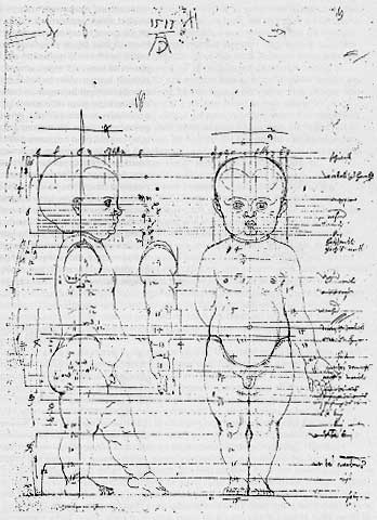 Albrecht Dürer, Geometrische tekening van een kind met de aantekeningen: hoogste punt van het hoofd haarinplant wenkbrauw |