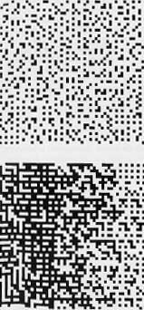 Zo ontstaan naast de middelpunts-vierkantjes ook 'balken' van twee en drie zwarte vierkantjes hoog of breed. In het rechter kwart van de structuur (tussen de diagonalen in) worden nieuwe beeld-elementen gevormd doordat deze balken elkaar snijden. Daar waar aldus vierkantjes bij elkaar kwamen, werden zij met twee aangevuld tot een rechthoek van zes; waar het er vijf waren, vulde Struycken ze aan tot een vierkant van negen. De geïnteresseerde lezer kan volgens de zojuist beschreven procedure het basisstramien zelf aanvullen tot de structuur van de zeefdruk. Daarmee wordt hij nog geen kunstenaar, en Struycken niet minder een kunstenaar. Het is de kundigheid van de kunstenaar een boeiend visueel systeem te ontwerpen en uit te voeren. Het achteraf analyseren van dat systeem is op zichzelf niet creatief. Wel kan men daarmee de in een structuur voorkomende elementen beter leren onderscheiden en hun samenhang doorzien. |