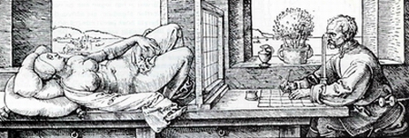 Op de houtsnede 'De tekenaar van de liggende vrouw' kijkt de tekenaar door een vizier naar zijn model. Tussen hen in is een raam aangebracht dat in gelijke vakken is verdeeld. De kunstenaar brengt datgene wat hij in deze kwadratuur ziet, over op een blad dat voorzien is van vakjes die corresponderen met die op het raam.'Perspectief', aldus Dürer, 'is niets anders dan het bekijken van een voorwerp door een glasplaat waarop het onderwerp dat zich achter het glas bevindt, wordt vastgelegd. Die uitspraak had Dürer niet van zichzelf. Da Vinci had al vóór Dürer beweerd dat een schilderij vergelijkbaar was met een raam dat uitzicht biedt op een stukje van de wereld. Dürers tekenapparaat, of beter gezegd Dürers perspectiefraam had één groot nadeel: het was alleen geschikt om bestaande situaties vast te leggen; voor de weergave van een fantasievoorstelling was het volstrekt onbruikbaar. In dit laatste geval was een kunstenaar verplicht om het perspectief te construeren. |