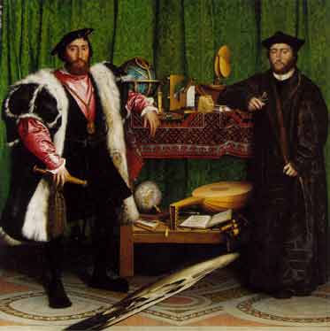 De eigen aard van de anamorfosen brengt met zich mee dat er een bijzondere relatie ontstaat met de voorstelling, die op deze manier vertoond wordt. Deze is op het eerste gezicht onherkenbaar. Eén van de mogelijkheden die door anamorfosen geboden wordt, is dus het verbergen van een voorstelling. Binnen de context van een normale perspectivische voorstelling valt een anamorfose uit de toon. Vanuit de juiste hoek bekeken geeft het vertekende beeld achteraf een extra betekenis aan een schilderij. Zo werkt ook de beroemdste van alle anamorfosen in Holbeins 'Ambassadeurs' uit 1553. Een vreemd object op de voorgrond van dit dubbelportret blijkt een schedel te zijn. Het gehele schilderij wordt daardoor in het licht van de vergankelijkheid gesteld. De dubbelzinnigheid van de voorstelling wordt concreet gemaakt door twee illusiemechanismen: het trompe-I'oeil perspectief en de anamorfose. |