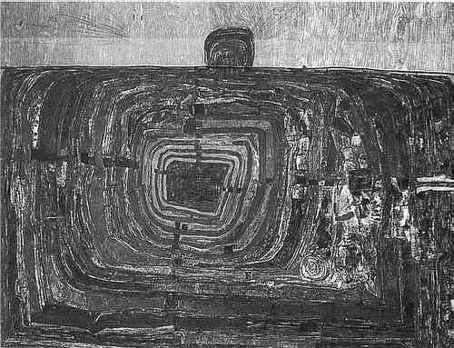| Minstens 90 % van zijn werk is op vaak niet eens geprepareerd papier geschilderd; meestal neemt hij het eerste het beste dat hem voor de hand komt en dat kan pakpapier zijn of posters of papieren zakken, gewoonlijk verkreukeld, gescheurd, gevouwen of anderszins beschadigd. Hij beschildert het papier met wat hij toevallig bij zich heeft. Beschrijvingen van zijn materialen zijn verbijsterend ingewikkeld en omvatten waterverf, ei, olie, lakverf, houtskool, polyvinyl, goud en bronspoeder, zilver en aluminium-folie, Afrikaanse aardverven enzovoort. Hij zegt dat hij bij technische problemen een handboek gebruikt, maar gemeten aan zijn schilderijen is dit maar een beperkte bron van wijsheid.(...) Hij gebruikte in 1953 voor het eerst de spiraal in zijn schilderijen. Sindsdien zijn zijn motieven dezelfde gebleven. Behalve de onvermijdelijke spiraal omvatten ze huizen en ramen, gezichten en ogen, bomen, boten, hekwerken en regendruppels of tranen. De kunstenaar heeft vaak gesproken over de betekenis van de spiraal: hij zegt dat deze voor hem dingen weergeeft als geboorte, beweging, het begin en einde. Soms is het gewoon een vorm die het beste uitkomt als hij niks anders weet. Dat hij de spiraal zou hebben 'uitgevonden' is net zo belachelijk als wanneer Mondriaan zou beweren het vierkant te hebben uitgevonden. | ||