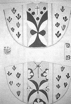 gewijd aan Christus de verlosser en aan de hoop die ermee verbonden is.(...) De rode kazuifel, die met Pinksteren gebruikt wordt, verbeeldt het bloed van de martelaren maar ook de goddelijke liefde, het vuur van de liefde. De dubbelzinnigheid van de christelijke symboliek hield Matisse ongetwijfeld bezig. Op die kazuifel verspreidt het rood het vuur over de hele stof met behulp van gele palmen (de palmen van de martelaren) en het Andreaskruis bestikt met Griekse kruisjes.(...) |