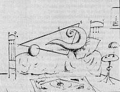 | Eenmaal opgeklommen tot de status van driedimensionale eenheden ontmoeten de tekstballonnen elkaar heimelijk in hotelkamers: 'Hotel Plaka, een hotel in Athene. Dit maakt deel uit van een reeks erotische tekeningen - een parodie op porno die laat zien hoe conventioneel wij door de erotiek worden gemanipuleerd. Hier ligt het erotische element alleen in de locatie: een hotelkamer als het meest banale decor voor erotiek. De liefde bestaat hier uit een dialoog in bed van twee tekstballonnen die met elkaar versmelten. In een andere tekening doorboort een driehoek van Pythagoras een vraagteken. Men zou kunnen zeggen dat het dikke en wulpse vraagteken de vrouw is terwijl de precieze geometrische driehoek als symbool van logica de man is. Maar dit geeft wel blijk van onze vooroordelen, omdat men altijd denkt dat de man de logische rol speelt terwijl de vrouw een eenvoudig vraagteken is met alle onzekerheid die bij dat symbool hoort. In feite kan het net zo goed gaan om een affaire tussen een vette man en een slimme vrouw. In andere tekeningen stopte ik bepaalde cijfers die vanwege hun vorm erotisch zijn in bed: 5 en 2 bijvoorbeeld. (1, 4 en 7 hebben geen sex-appeal)' (...) | ||