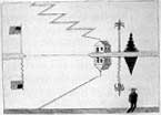 | Steinberg zet de hersens van de beschouwer aan het werk en blijft ze bezig houden door het verlangen naar een oplossing te frustreren. Een woord of een cijfer kan worden geanalyseerd als een hypothetische situatie in dramatisch perspectief. Een kat met zijn kop rondneuzend in het bovenste deel van een uit draad gevormde 4 die in de grond staat, is het produkt van de volgende Steinbergiaanse analyse van de cijfers als materiële vormen, een analyse die wordt doorgevoerd vanuit het gezichtspunt van katten die bekend staan (dat wil zeggen met het clichématige etiket) om hun nieuwsgierigheid (Kat en 4). Steinberg: 'Vier is een interessant cijfer omdat het een vorm is die de nieuwsgierigheid van een kat zou kunnen opwekken. De meeste cijfers zijn open of gesloten. Het cijfer 8 is bijvoorbeeld gesloten; een kat voelt geen enkele behoefte om naar binnen te turen. Een kat houdt ervan om te gluren in iets dat half open is, een heel klein beetje open - een mysterie. | ||