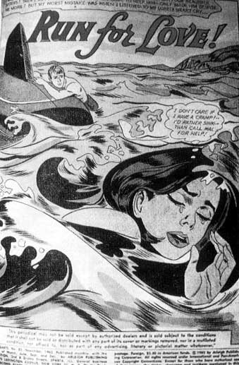 Superman en Batman stonden bovenaan in de hiërarchie van de strip-verhalen, onderaan stond het winstgevende romantische stripverhaal zonder diepgang. Nog lager bevond zich een reeks van oorlogsstrips voornamelijk voor jongens bedoeld. Heart Throbs, Secret Hearts, All-American Men of War, Our Fighting Forces, Our Army at War alleen deze ouderwetse titels al roepen de enorme afstand op ten opzichte van welke pop-cultuur dan ook in deze wereld met figuren als Marlon Brando en Elvis Presley. Deze strips die in toenemende mate alleen nog door jongeren en 'dombo's' gelezen werden, gingen over steeds dezelfde een of twee verhalen die eindeloos uitgemolken werden. De romantische strips op hun beurt waren eerder huilerig dan moraliserend. In plaats van een beeld op te roepen van een gewiekste pak-die-vent-moraal, leken hun heldinnen met open ogen van de ene huilerige omarming naar de andere te fladderen. De laatste pagina van zo'n typerend verhaal begint bovenaan met de heldin die haar prins met het kuiltje in zijn kin verliest, en die vijf plaatjes later in de armen belandt van een ander. De emotionele hoogtepunten van zo'n stripverhaal zijn niet dezelfde als die van vervolgseries of verhalen uit damesbladen waarop ze zo overduidelijk gebaseerd zijn, maar spelen zich alleen af in een enkel plaatje van onbeantwoorde emotie: het huilende meisje in extreme close-up, snakkend naar liefde. (...) | |