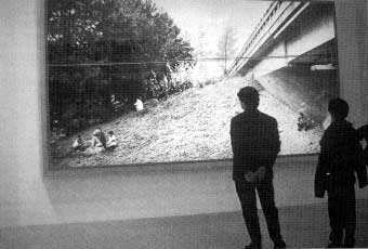 Waar Boltanski zorgeloos omgaat met de conventionele techniek of de afdrukkwaliteit van de foto's, gebruikt Wall een geperfectioneerde technische noviteit, transparante Cibachrome 1) vergrotingen in lichtboxen. Wall wil de moderniteit herstellen - in de zin van realisme en objectiviteit - van klassieke kunstenaars als Velasquez, Goya of Manet. Hij wil de sociale kracht van deze beelden herbewerken in een nieuwe techniek. Wall houdt zich in het bijzonder bezig met het idee van de voorstelling; hij let op elk detail en gebruikt acteurs in natuurlijke of gereconstrueerde decors die gekozen zijn, nadat hij zijn locaties even zorgvuldig als een filmmaker heeft uitgezocht. Al deze trucages zijn ontworpen om ons van de waarachtigheid van het beeld te overtuigen - terwijl het in feite allemaal kunstmatig is. De schitterende uitvoering van de 'superfoto's', beschermd door hun presentatiesysteem, levert een 'blijf af'effect op dat de toeschouwer op afstand houdt. Emoties worden voortdurend onderdrukt in zijn realistische voorstellingen van banale, zelfs smerige levens; ze liggen besloten in wat Wall noemt dwingende en mechanische 'microgebaren', waarmee de karakters een toestand van sociale spanning, crisis en malaise uitbeelden. Walls heldere en rationele presentatie van zijn karakters biedt ze op z'n minst de mogelijkheid van een zelfbewustzijn dat hen uit hun huidige geestesgesteldheid zou kunnen bevrijden en ze hun eigen bestaan zou kunnen laten vinden. 1) merk fotomateriaal |