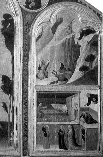 het midden als een scharnier bij de overgang van staan naar lopen. De simultaanbeelden van het Beato Agostino-paneel verenigen steeds de beide scènes van rampspoed en redding in één beeldruimte. De afzonderlijke momenten worden slechts luchtig door architectuur- of landschaps-elementen van elkaar gescheiden. Identieke figuren verschijnen meermalen in hetzelfde beeld. Simone bedient zich van de doorlopende verhaaltrant en kiest de beide pregnante momenten binnen het chronologische verloop van de handeling om de directheid van het wonder zichtbaar te maken. De beide scènes maken samen met de figuur van de heilige de bedoelde zeggings-kracht van het wonder compleet. De gestalte van Agostino bemiddelt in zekere zin tussen de in tijd uit elkaar liggende scènes. Men moet verder bedenken dat de beschouwer anders dan bij de wonderverhalen uit het Nieuwe Testament het wonder niet kent uit literaire bron. |