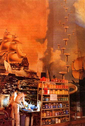 | Het tempo en de denkstappen zijn nauwelijks bij te houden. Het merkwaardige is dat Scholte die methode ook in zijn schilderijen hanteert, en dat die heel overtuigend werkt. De wandschildering, in 1991 op de computer ontworpen, is illustratief voor Scholtes autobiografische aanpak. Hij begint bij een persoonlijke ervaring en komt dan al associërend, nadenkend en afbeeldingen verzamelend tot een nieuwe voorstelling waarin hij zijn visie op de wereld uitdrukt. In 1991 was het autobiografische uitgangspunt natuurlijk het Nederlandse jochie dat met een bootje speelt, en misschien droomt van avonturen op de wereldzeeën en van verre landen. Hoewel het ventje wel op Scholte lijkt, is het niet gebaseerd op een jeugdfoto van hemzelf: hij gebruikt altijd 'onpersoonlijk' materiaal. Hij is een expressionist die niet-expressieve middelen gebruikt. Hij wil niet dat zijn kunst de allerindividueelste emotie is. 'Ik wil dat de wereld mij begrijpt, en ik de wereld begrijp'. | ||