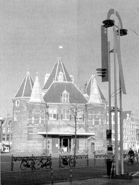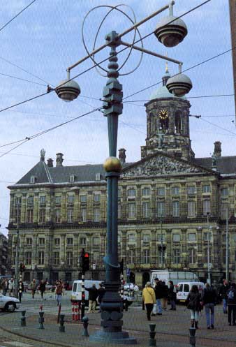 De drie kruisen onder aan de kleine paal verwijzen naar het wapen van Amsterdam, maar ook naar de eindeloze kolom van Brancusi. De organische vormen van Jean Arp en de opgestapelde dozen van Carel Visser zijn eveneens in onze palen terug te vinden.' Postma: 'Maar we hebben ook onze eigen handtekening gezet.' Schabracq vindt in het principe van de stapeling overeenkomst met zijn eigen werk: stapelt hij samen met Postma kubussen, cilinders en bollen, in zijn eentje stapelt hij voorwerpen. Op een maandagmorgen loop ik met Schabracq en Postma over het Damrak. Schabracq verwijdert stickers die 'lousy food & warm beer' adverteren van zijn prullenbakken. Postma bewondert de kleurencombinatie die het blauw van de palen en het baksteen van de beurs van Berlage oplevert. 'De palen zijn nog niet af', vertelt Postma. Om de lampen van de kleine palen komen nog zilverkleurige dozen en een frame van gele en zwarte buizen. Om de lantaarns van de grote palen komen ovale kappen en in de hoepels zal een perspex ring waaruit geel licht schijnt, worden aangebracht. De Dam slaan Schabracq en Postma over. |