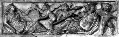 Klassieke sarcofaag waarop het motief van de liggende figuren van Botticelli voorkomt |