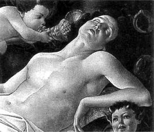 Alberti raadde schilders als bron Seneca's beschrijving van een schildering van de Drie Gratiën aan. Hierin dansen de Gratiën, naakt of in doorschijnende gewaden, hand in hand, terwijl de ene Gratie de weldaden van Venus aangeeft, de tweede Gratie ze in ontvangst neemt en de derde ze weer weggeeft. Het laatste woord over deze intrigerende allegorie is nog niet geschreven. Zo is er bijvoorbeeld nog geen verklaring gevonden voor het sinaasappelbos (-). Voor een Florentijn uit de vijftiende eeuw is de relatie tussen deze goudkleurige ballen en het wapen van de Medici, zowel door Lorenzo de Pierfrancesco als Lorenzo il Magnifico gedragen, meteen duidelijk. Mercurius' prachtige roze chlamys 1) is bezaaid met gouden vlammetjes, een attribuut van Mercurius. Maar dergelijke vlammen horen ook bij S. Lorenzo en versieren zijn kleren in vele andere schilderingen. De vallende sterren die ieder jaar in augustus te zien zijn, worden in Italië 'het vuur van S. Lorenzo' genoemd omdat zij op zijn feestdag te zien zijn. De vlammen zijn echter niet alleen het attribuut van S. Lorenzo en Mercurius, ook Venus witte gewaad is aan de bovenkant voorzien van een rij gouden vlammen en heeft twee cirkels, gevormd door deze vlammetjes, die langs haar borsten lopen. Rondom Venus groeit een laurierboom, Lorenzo's plant. En tot slot heeft Mercurius naast allerlei andere plichten zoals de zielen naar de onderwereld brengen en de Drie Gratiën begeleiden waarheen Venus dat maar wil, ook nog de verantwoordelijkheid voor de artsen. Zoals gezegd, betekent Medici in het Italiaans 'dokters' en 'dokters' waren de beschermheiligen van de Medici. 1) schoudermantel |
