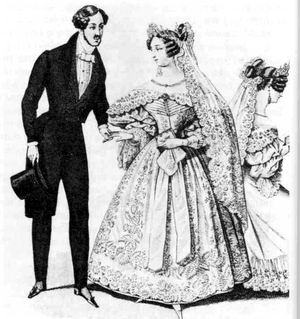 tot een traditie in de kleding van de bruid zijn geworden. De tot in onze tijd voortlevende traditie van witte kleding voor de bruid vindt waarschijnlijk zijn oorsprong aan het Engelse hof in de eerste helft van de achttiende eeuw. Zo ging Prinses Anna van Hannover bij haar huwelijk met Prins Willem IV van Oranje-Nassau in 1733 in het St.James'Palace te Londen gekleed in haar 'Virgin Habit', bestaande uit een robe (overkleed en rok) van zilverbrokaat. De symbolische betekenis van zilver of wit was ook toen reeds onschuld en maagdelijkheid. Al spoedig werd dit gebruik aan andere hoven in West-Europa nagevolgd. Zo ook aan het Stadhouderlijk Hof in De Haag bij het huwelijk van Prinses Caroline van Oranje-Nassau met Prins Carel van Nassau-Weilburg in 1760 in de Grote Kerk: 'Hare Hoogheid -, gekleed in een uitmuntend Gewaed van Zilveren Stoffe, zeer kostbaar gegarneerd, - Vier Dames (hofdames) om Hare Hoogheid de sleep te dragen-, lezen we in het Jaarboek van 1760. |