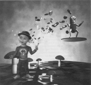 Aanvankelijk beperkte hij zich tot beelden die commentaar leveren op de maatschappij en op het kunstbedrijf. De hippietijd bijvoorbeeld is in 'Warsong' (1993) in een digitaal jasje gestoken: een paddopop in een camouflagepak tokkelt op zijn virtuele gitaar. Vanaf 1995 neemt Klein de house-cultuur onder de loep. Hij is dan een internationaal vermaard video-jockey geworden die de house-feesten met zijn 'in real time' gemonteerde computerprojecties 'een smoel geeft', zoals hij zelf zegt. Ook zijn 'Virtualistic Vibes'(1995) geeft de house een gezicht. In vier panorama's zetten Klein en zijn vrienden en vriendinnen zichzelf ironisch te kijk met een gemaakte heftigheid die de beste reclameboodschap ver achter zich laat. Op hun virtuele Olympus snoepen ze van de ecstasypillen die er over de wolken rollen. Op het asfalt onder hen breekt de pleuris uit. Daar valt niets te slikken om mellow van te worden. |