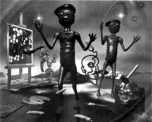 Ik was helemaal weg van die computer en het was echt de domste, kleine computer met alleen maar diskettes en 512 KRam of zo. Als ik die dan eens een keer een weekend mee naar huis mocht nemen, ging ik helemaal uit mijn bol. Ik maakte animaties en tekeningen en ik scande mijn foto's en ik kleurde ze om. Acid house kwam toen net op en wat er uit de beeldbuis knalde, dat ging daarmee totaal gelijk op. Ik begon in die tijd ook feesten te organiseren. In die periode zag je trouwens een omschakeling van de cultuur. Je had de opkomst van house en tegelijkertijd de instorting van de kunstmarkt. (-In 1989 ben ik afgestudeerd met een videowerk en grote dia-lichtbakken, dat was toen heel high-tech voor die school. Niemand wist waar ik aldoor mee bezig was. Op een gegeven moment kwam ik met een rijtje dia's aan die uit de computer kwamen, ze hadden er geen idee van dat dat kon. |
