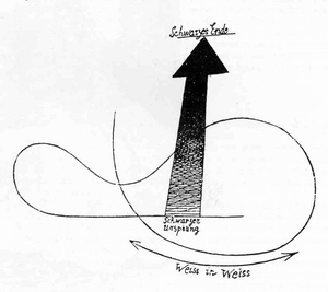 De pijl als symbool van de toekomst Zoals de bliksem een aankondiging is van de kosmische dynamiek in de hemel, zo verschijnt de pijl in Klee's beeldende wereld als grafisch teken van spanning in het verloop van een ontwikkeling, een 'genesis'. Zoals hij in zijn Pedagogisch Schetsboek uitvoerig heeft toegelicht, heeft Klee hem in de eerste plaats ingezet als symbool voor richting in zijn wereld van ruimte en tijd. In de tweede plaats heeft hij hem toegepast als toekomstsignaal van zich ontwikkelende aardse, onderaardse en kosmische activiteiten. Dit is de zwarte pijl die, zoals Klee schrijft, vanuit het tegenwoordige wit op het actieve en toekomstige zwart georiënteerd is. Hij omvat dus heden en toekomst, wordt teken van een dynamische toename van energie en geeft evenwichtsspanningen aan bij zuiver natuurkundige processen, of hij is uitsluitend een intellectuele wegwijzer bij pedagogische uiteenzettingen. Hij kan zelfs een dramatisch, onafwendbaar noodlotsteken worden dat vanuit de hemel de menselijke maatschappij bedreigt, zoals in de 'getroffen' plaatsen en steden die Klee verschillende keren schilderde. Hier hangt hij als een tastbaar onheil, als zwart zwaard van Damokles boven de in elkaar verweven, op plattegrond en opstand lijkende symbolen van stedelijke nederzettingen. |