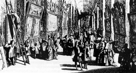 Ik kon nauwelijks begrijpen hoe ik in staat kon zijn te verkeren met de beroemde doden die ik daarvoor alleen had gekend door de glans van hun roem, of hoe ik door een verandering van het decor mijzelf het ene ogenblik kon bevinden in de eenzaamheid van de meest woeste woestijn of het andere moment in de vruchtbaarheid van het vrolijke platteland of in de verschrikking van stormen en schipbreuken. En dit allemaal terwijl ik midden op straat verbleef in de dichtstbevolkte stad ter wereld, die bijna 200 km van de dichtbijzijnde zee ligt. Tenslotte kon ik met het grootste genoegen de kunst door zijn onschuldige verzinsels van de natuur de waarheid van zijn voorbeelden zien eisen en op aangename wijze mijn ogen bedriegen door de laatste vruchten tussen de eerste knoppen ten toon te spreiden, alsof de herfst was overgeplant naar de lente'. (...) In 1699 werd de academietentoonstelling gehouden in de Grande Galerie van het Louvre met uitzicht op de rivier. Voor de eerste keer werd de tentoonstelling vergezeld van een expliciete uitspraak over haar educatieve en opiniërende bedoelingen. 'Het doel van de academie', zo stond te lezen in het gidsje of livret dat bezoekers konden kopen, 'was het in ere herstellen van de vroegere gewoonte om hun werken ten toon te stellen voor het publiek, om zijn oordeel te verkrijgen en om die waardevolle wedijver te voeden die zo nodig is voor de voortgang in de beeldende kunsten'. |