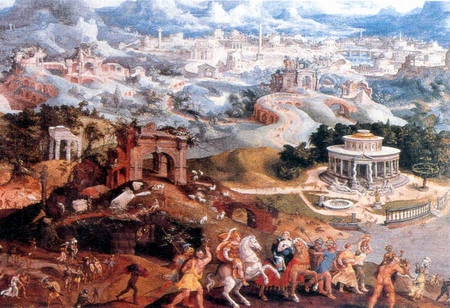 | Maarten van Heemskerck, Landschap met de ontvoering van Helena, 1535. Detail |
