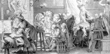 | Tekenschool in de 18de eeuw. Het model poseert op een draaischijf. |